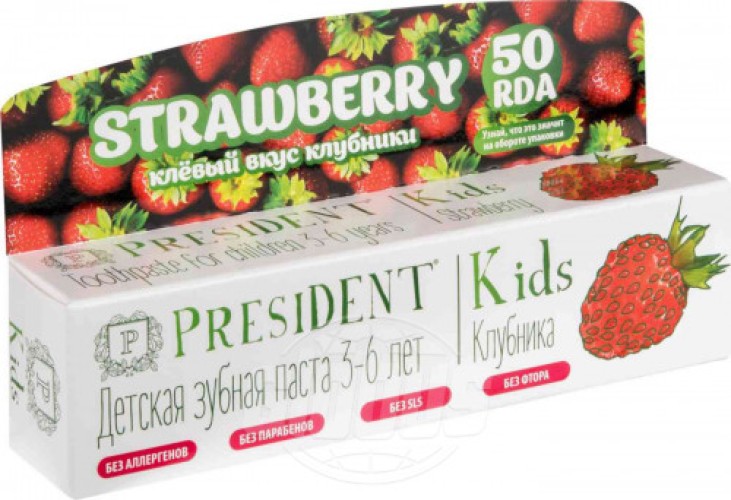 Паста PRESIDENT kids 3-6, обладая ярким вкусом клубники, очень нравится детям, обеспечивая свежее дыхание на протяжении длительного времени. Она не содержит вредных и аллергенных веществ, поэтому может использоваться без ограничений.